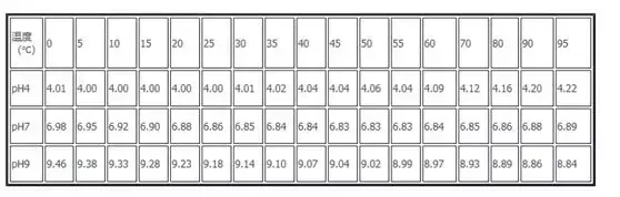 在电极进行校准时,最好等待缓冲液温度在标示温度下校准,这样测出的pH值才是缓冲液标示的值,比如pH 6.86和pH9.12的缓冲液是表示25℃下的pH值,那么你在20℃进行校准,显示的就不是6.86或者9.12。不过一般厂家都会附送一张缓冲液在不同温度下测的pH值,下图可以参考下。