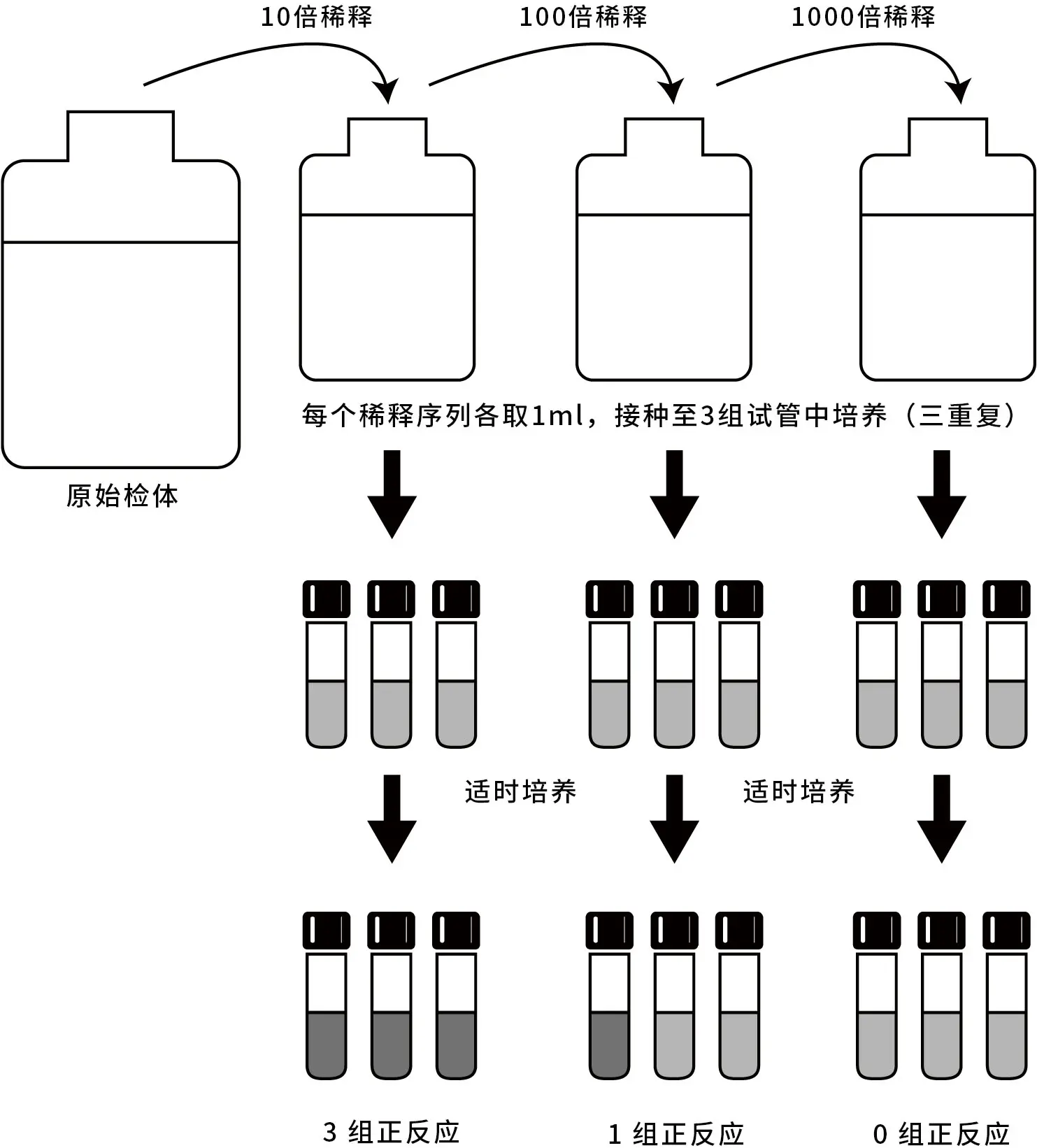 注一、视实验方法不同,每个稀释系列可能会做到 5 次重复的液体培养基的接种培养,即“三阶 5 支”。
