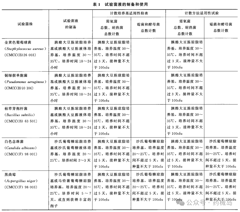 菌种 试验用菌株的传代次数不得超过5代(从菌种保藏中心获得的干燥菌种标准菌株为第0代),并釆用适宜的菌种保藏技术进行保存,以保证试验菌株的生物学特性。计数培养基适用性检查和计数方法适用性试验用菌株见表1。